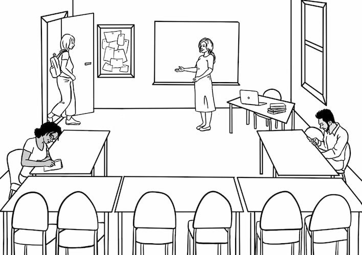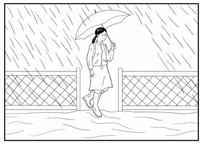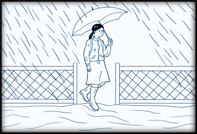 It rains on Tuesday. Mai walks to school in the rain again.